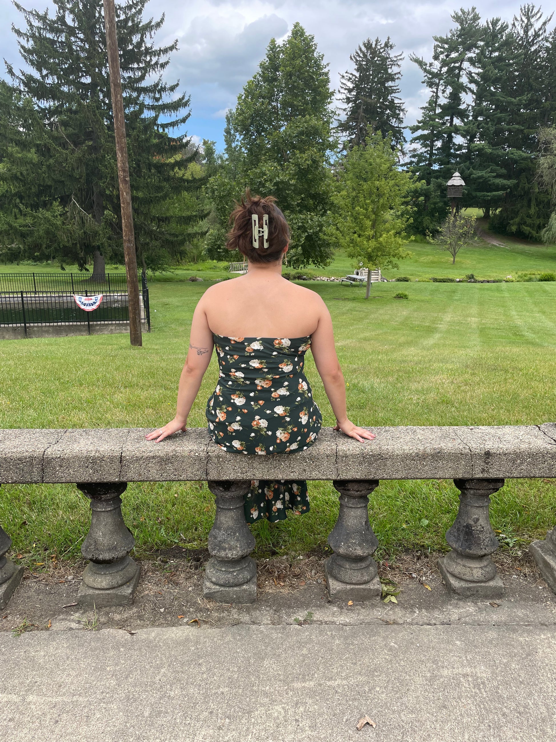 This Chayce Hunter Green Floral Strapless Maxi Dress is perfect for any Fall wedding or event.