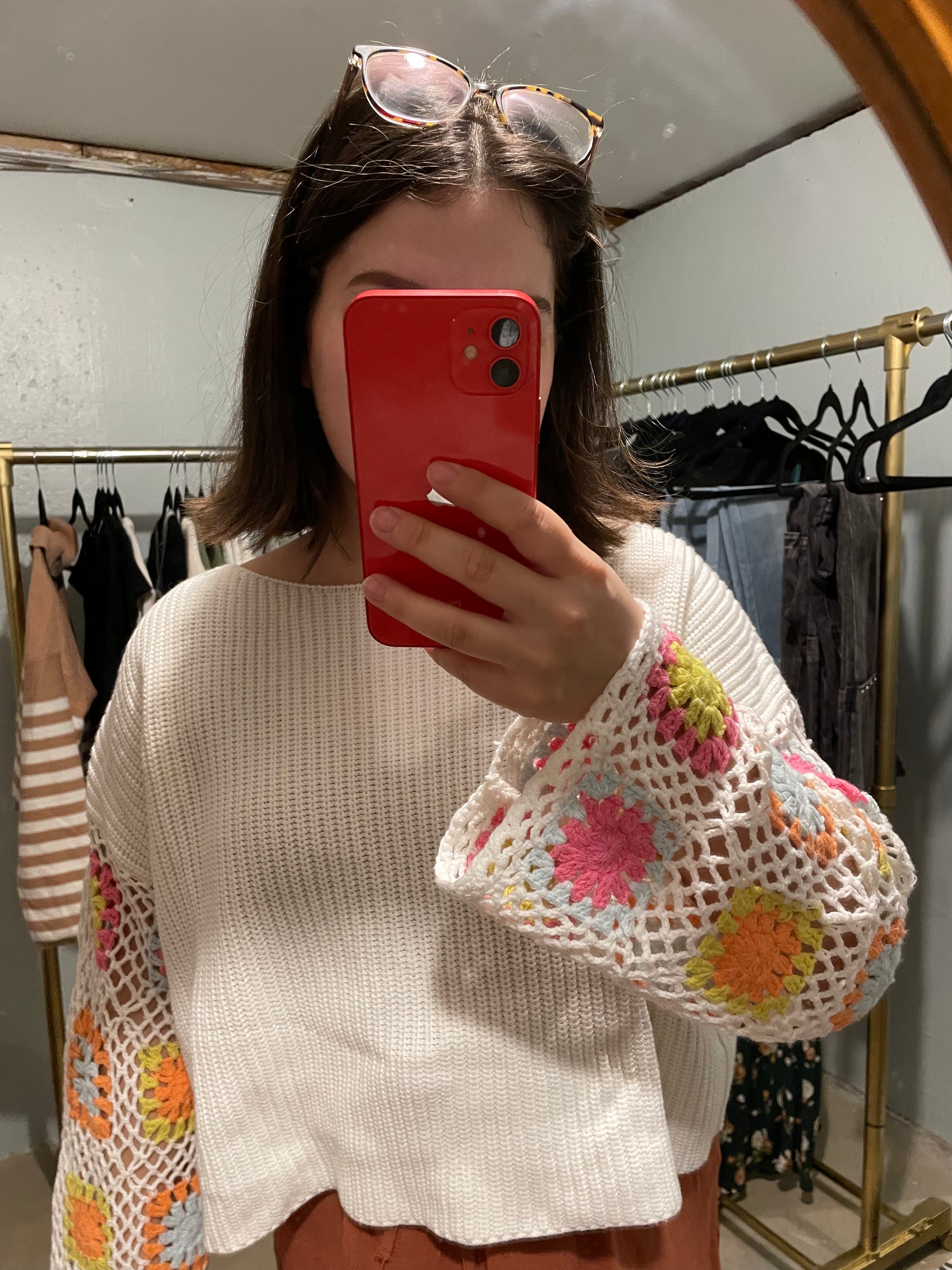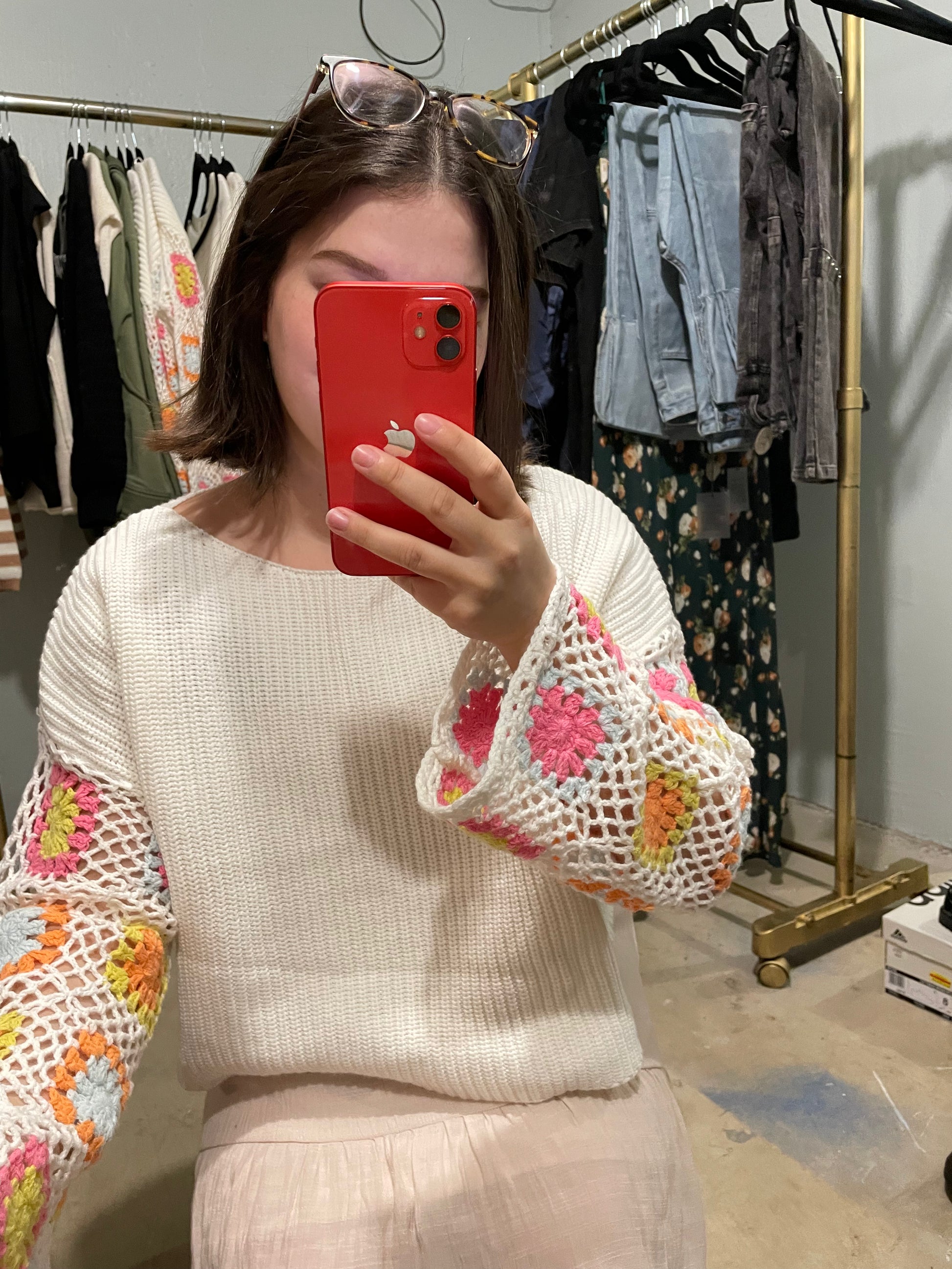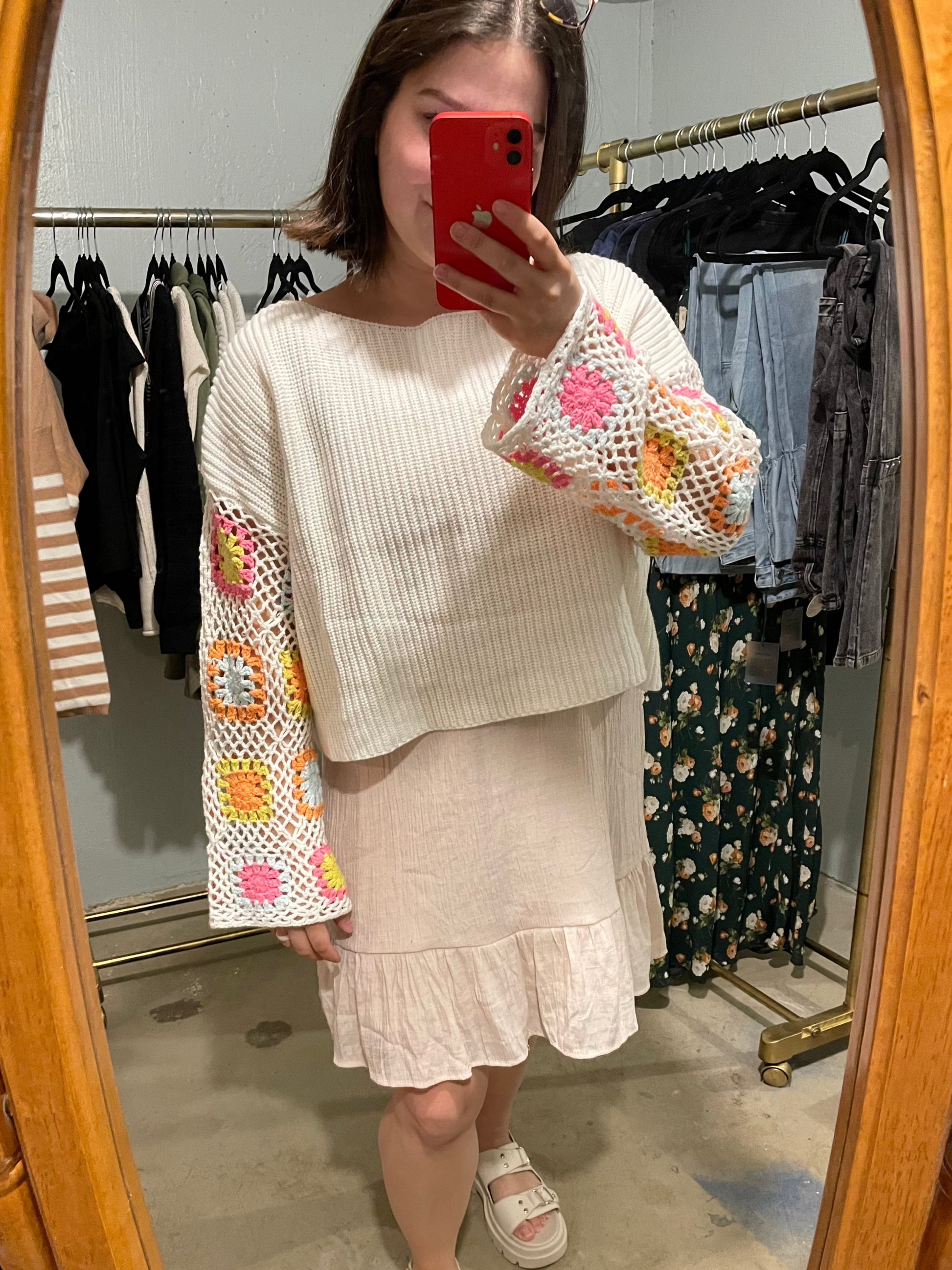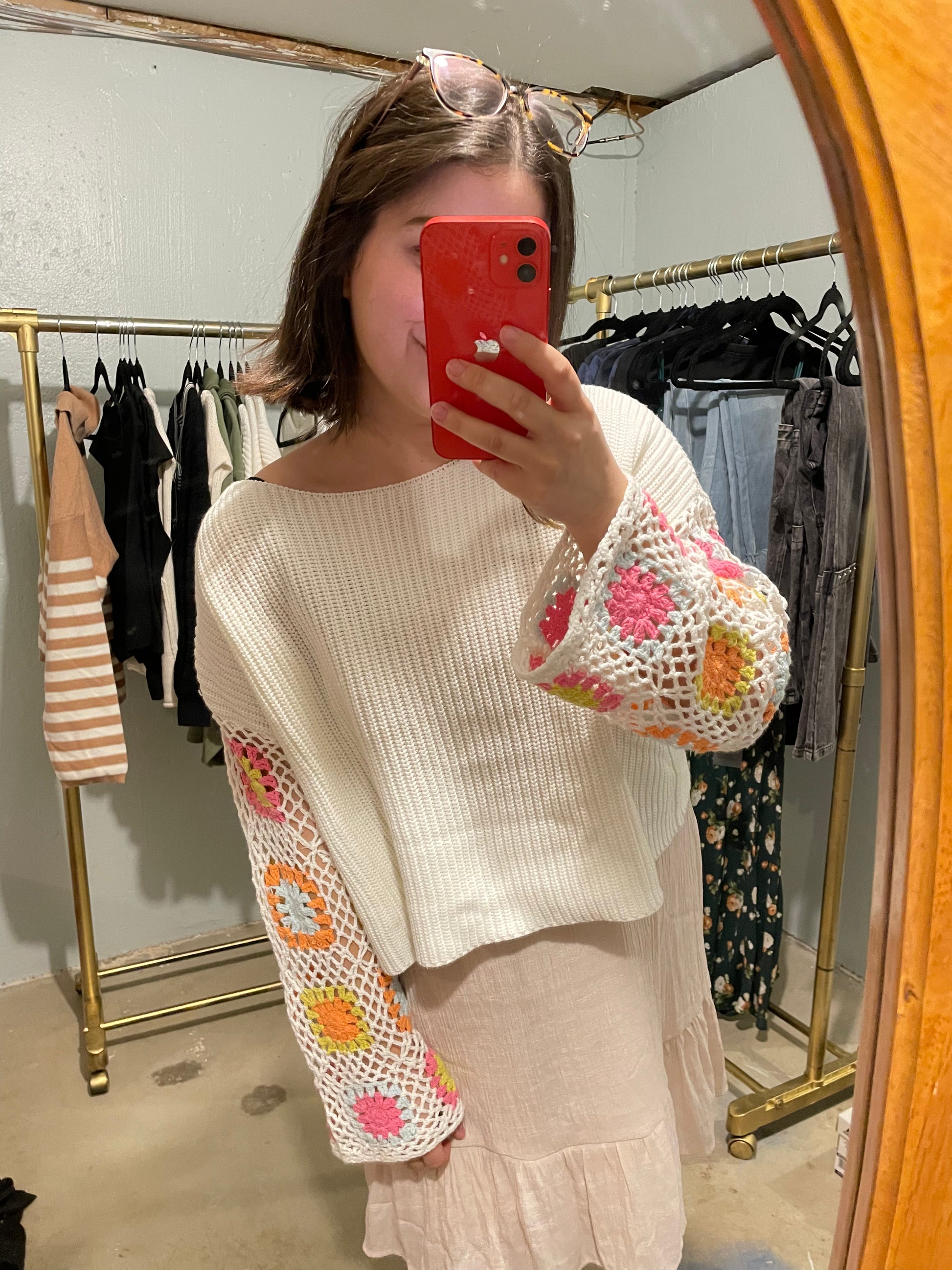 Introducing our Lucky Crochet Sleeve Knit Cream Sweater! Embrace the transition to spring with this versatile and stylish sweater. The crochet sleeve detailing adds a unique touch, making every outfit stand out. Stay comfortable and fashionable with this must-have piece.
