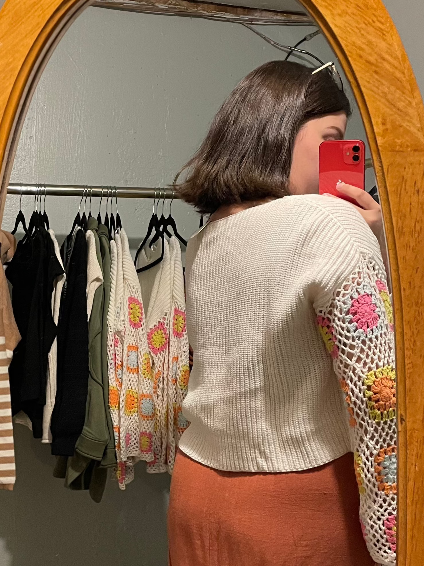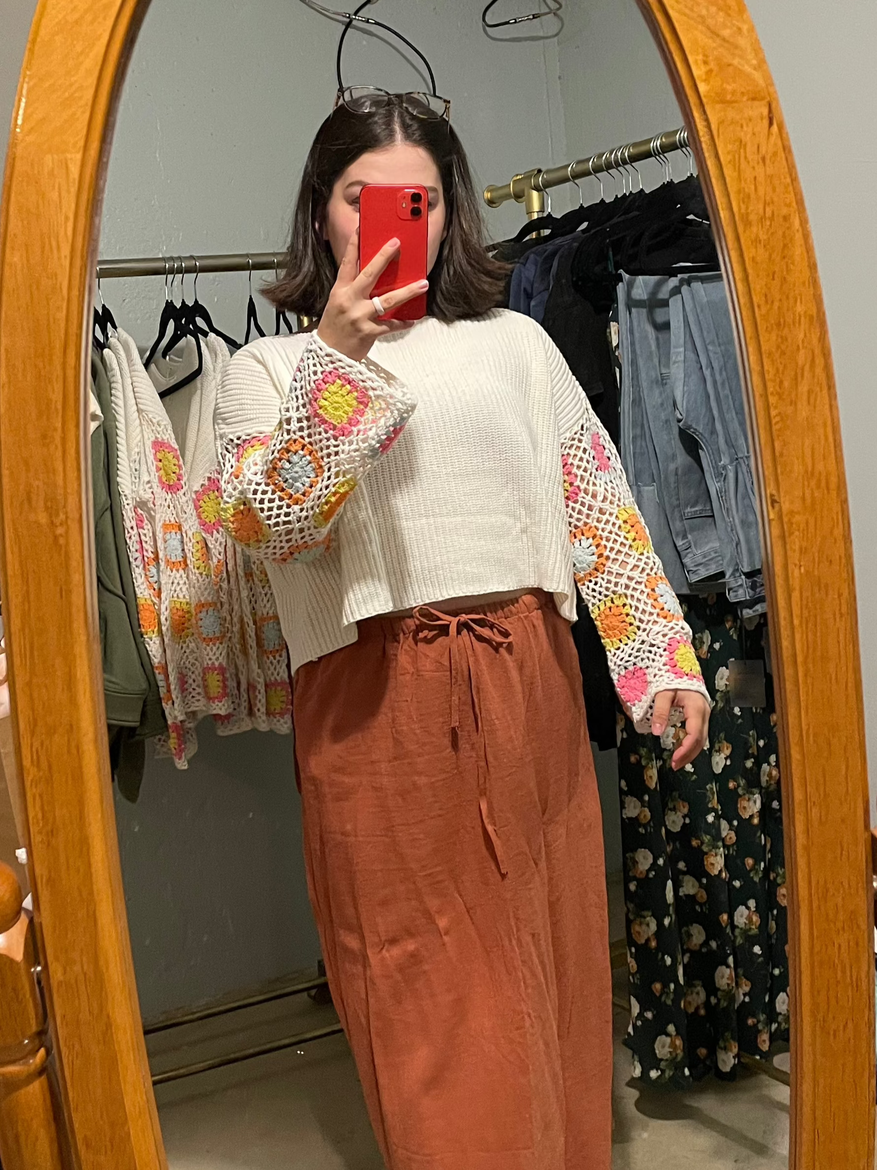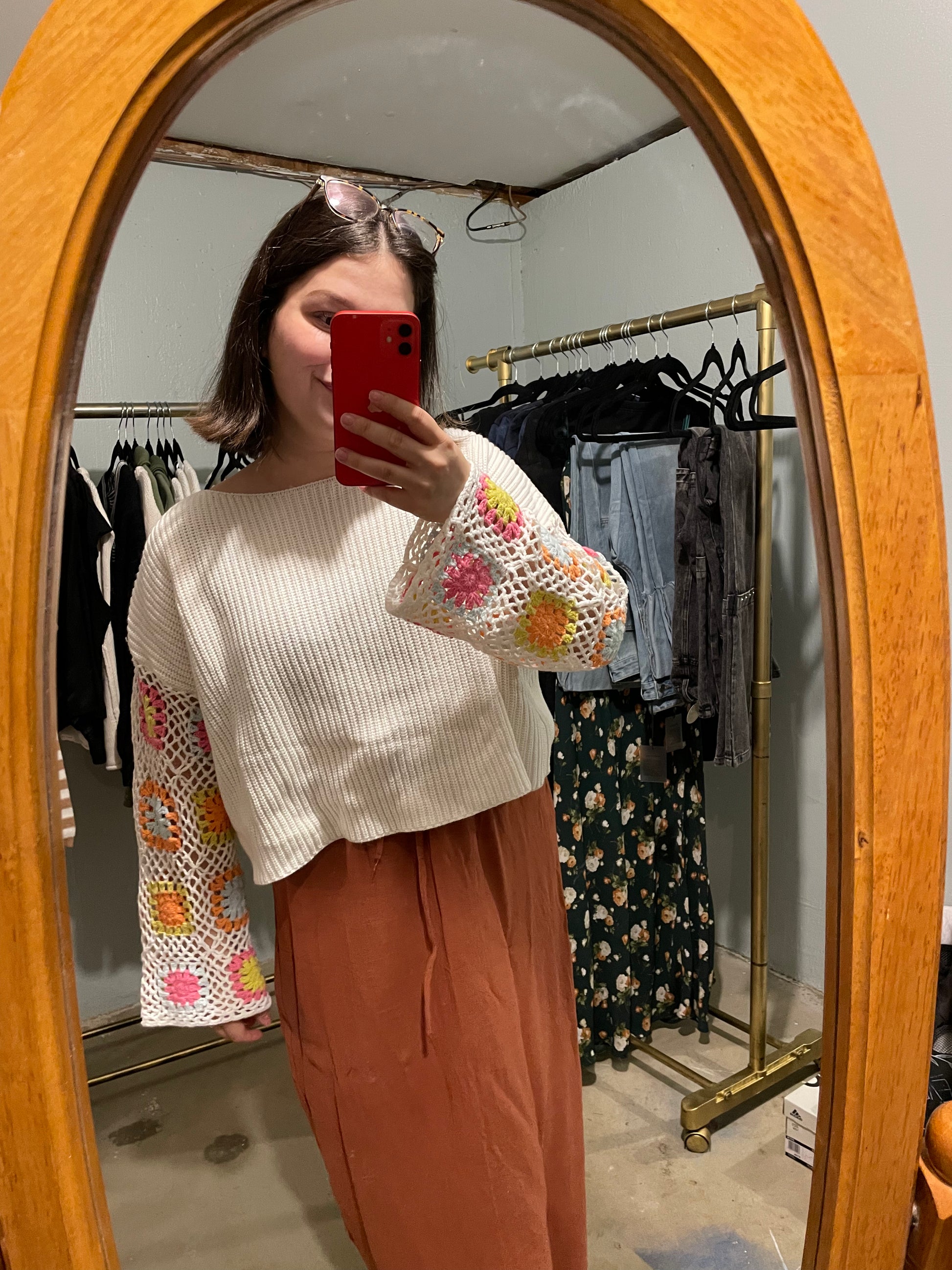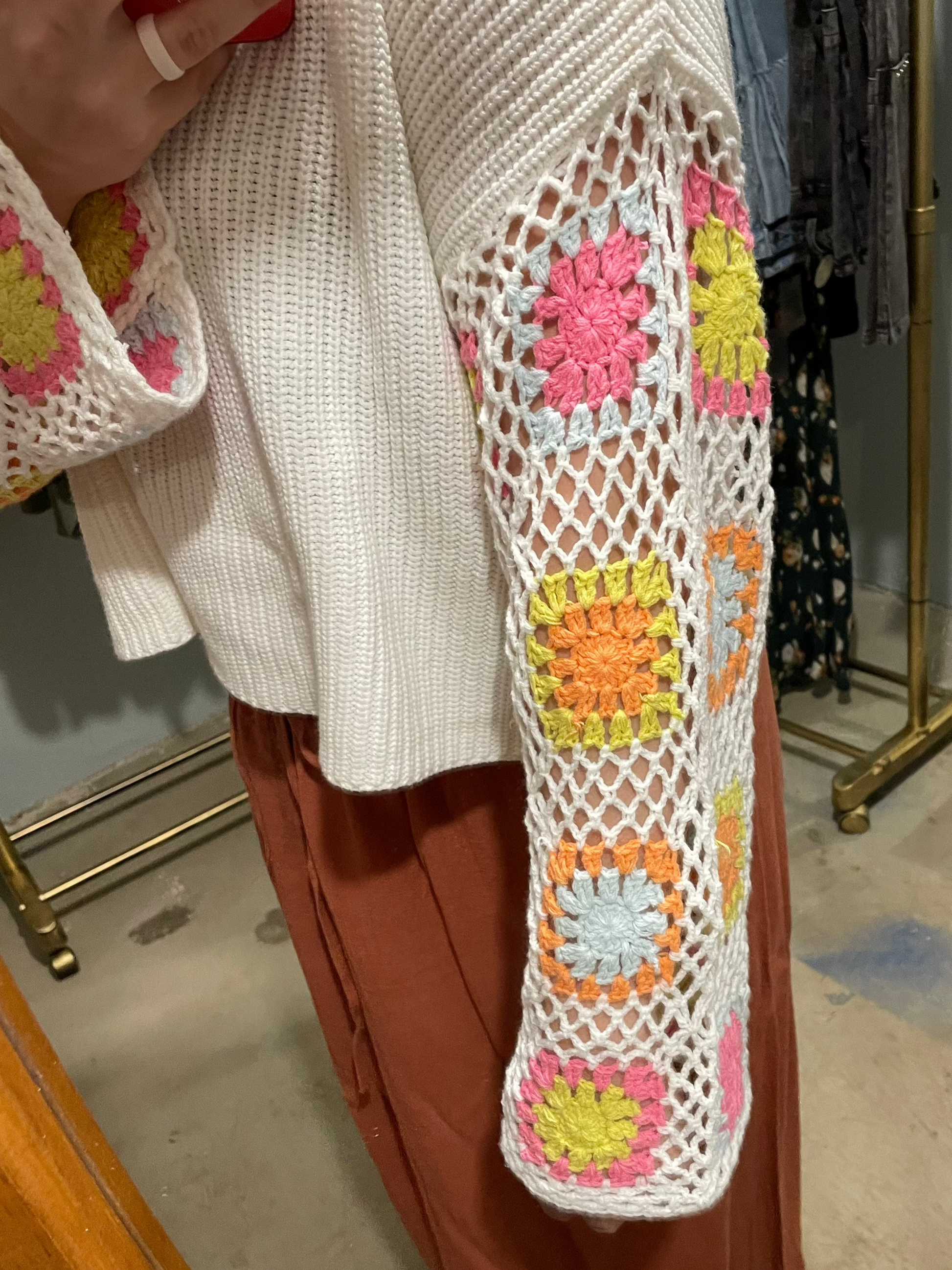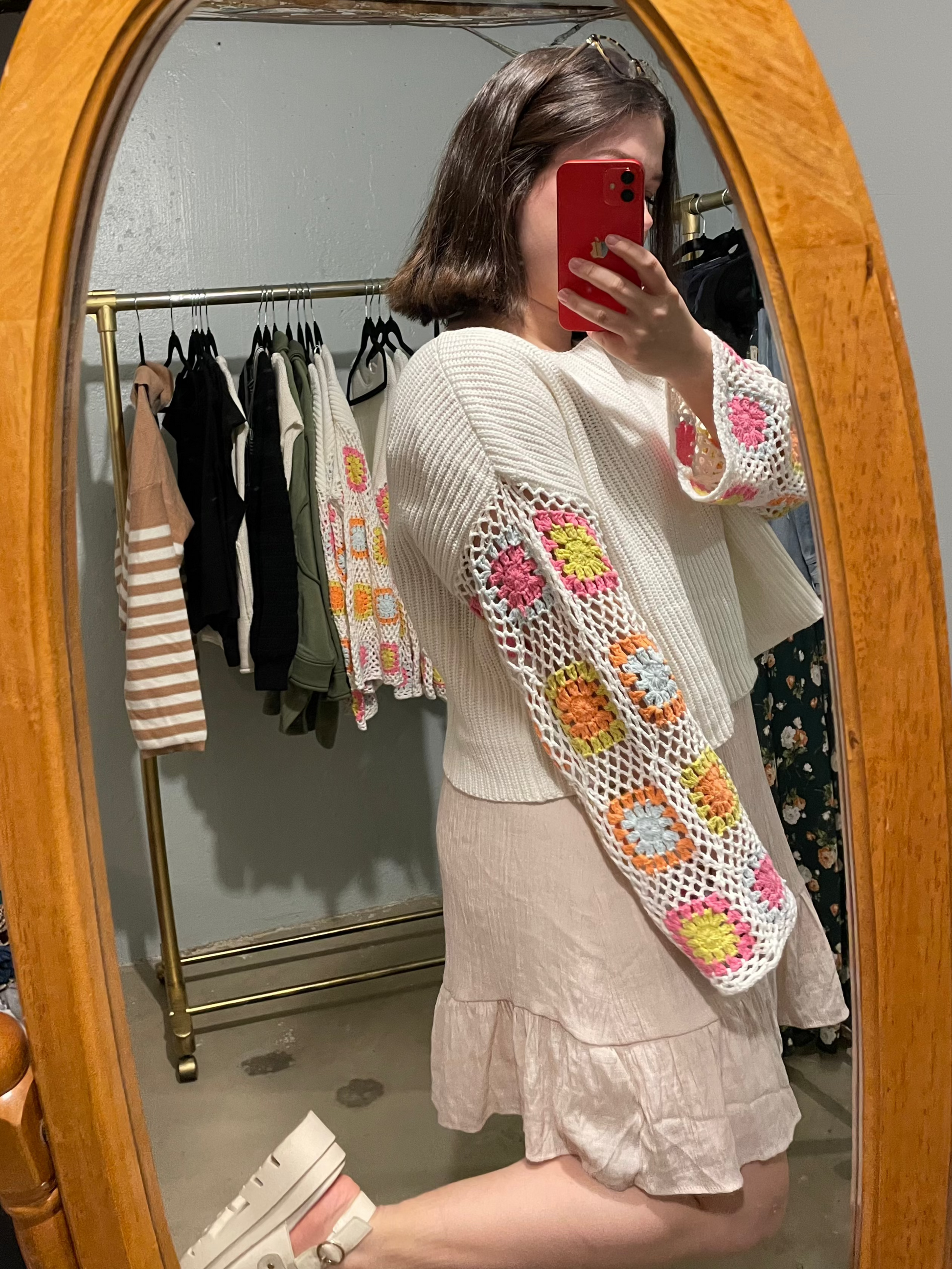 Introducing our Lucky Crochet Sleeve Knit Cream Sweater! Embrace the transition to spring with this versatile and stylish sweater. The crochet sleeve detailing adds a unique touch, making every outfit stand out. Stay comfortable and fashionable with this must-have piece.