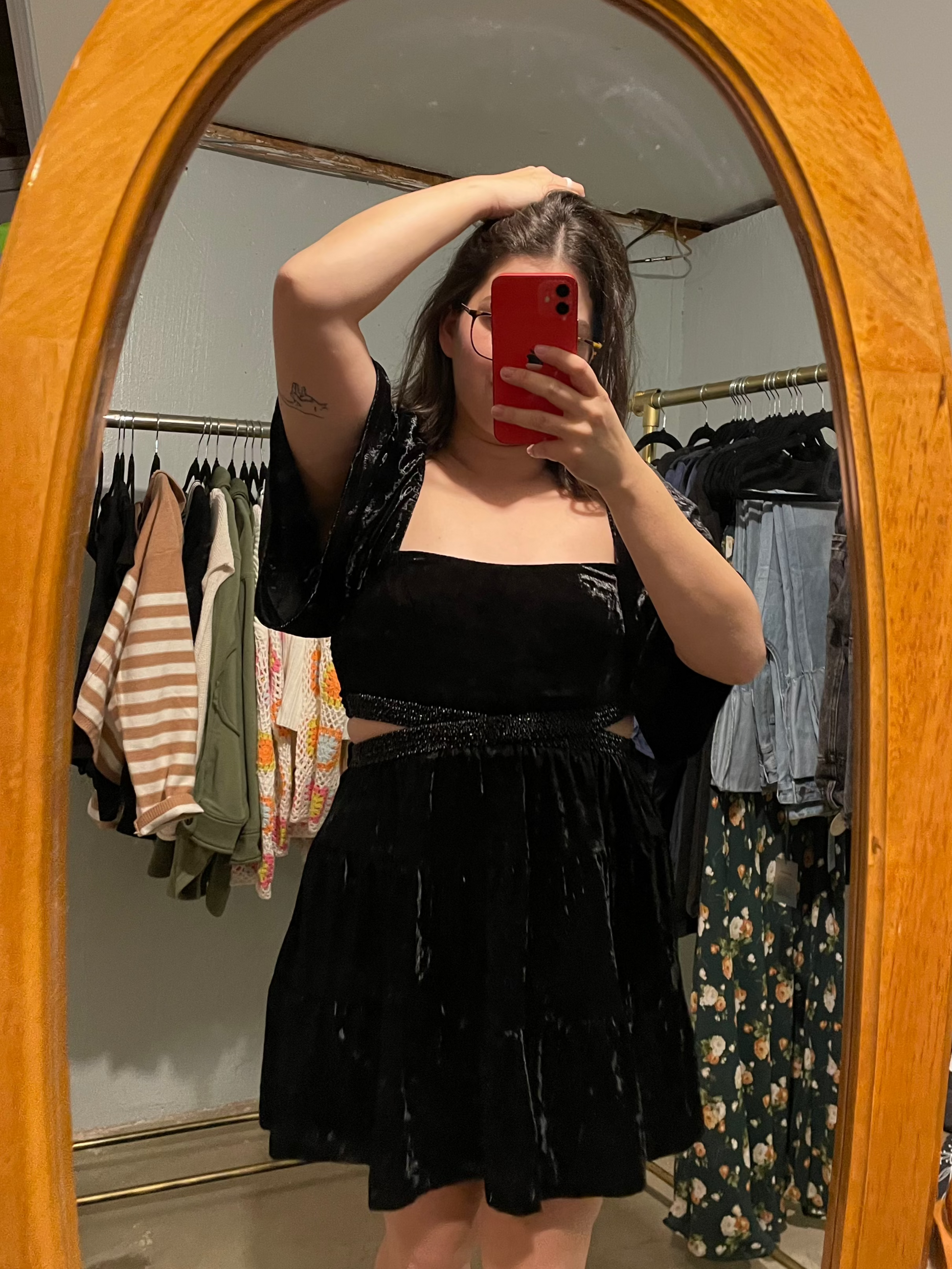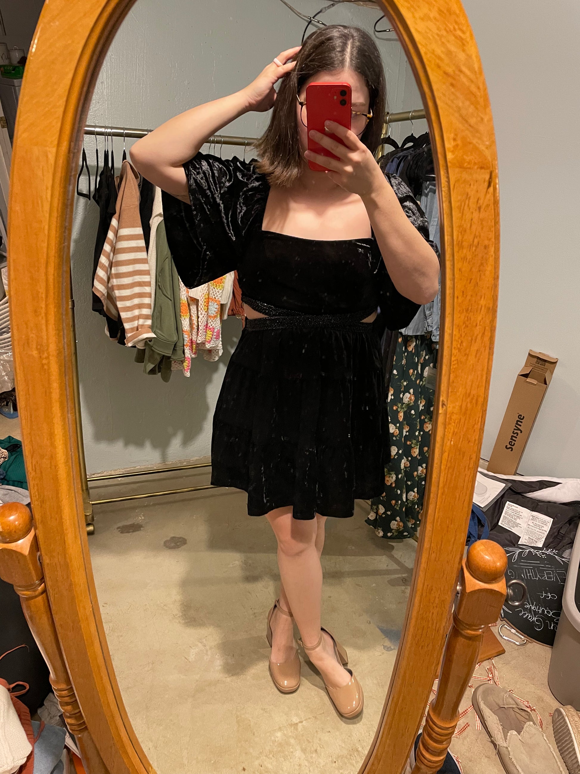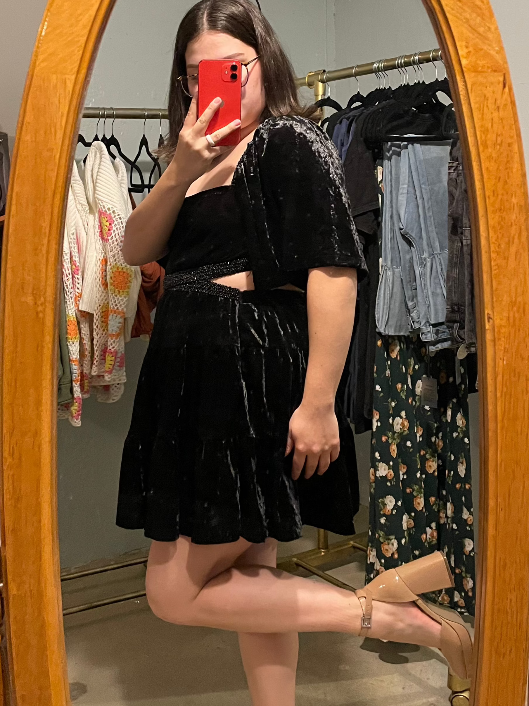 Vedette Black Velvet Beaded Waist Cutout Mini Dress